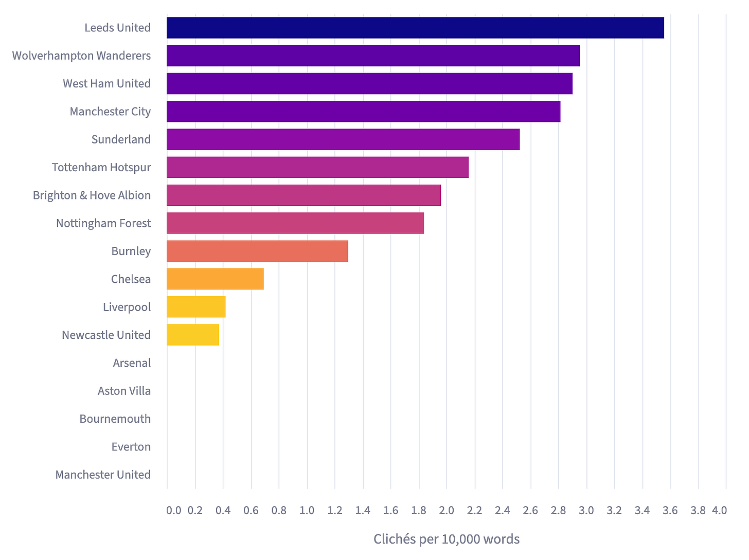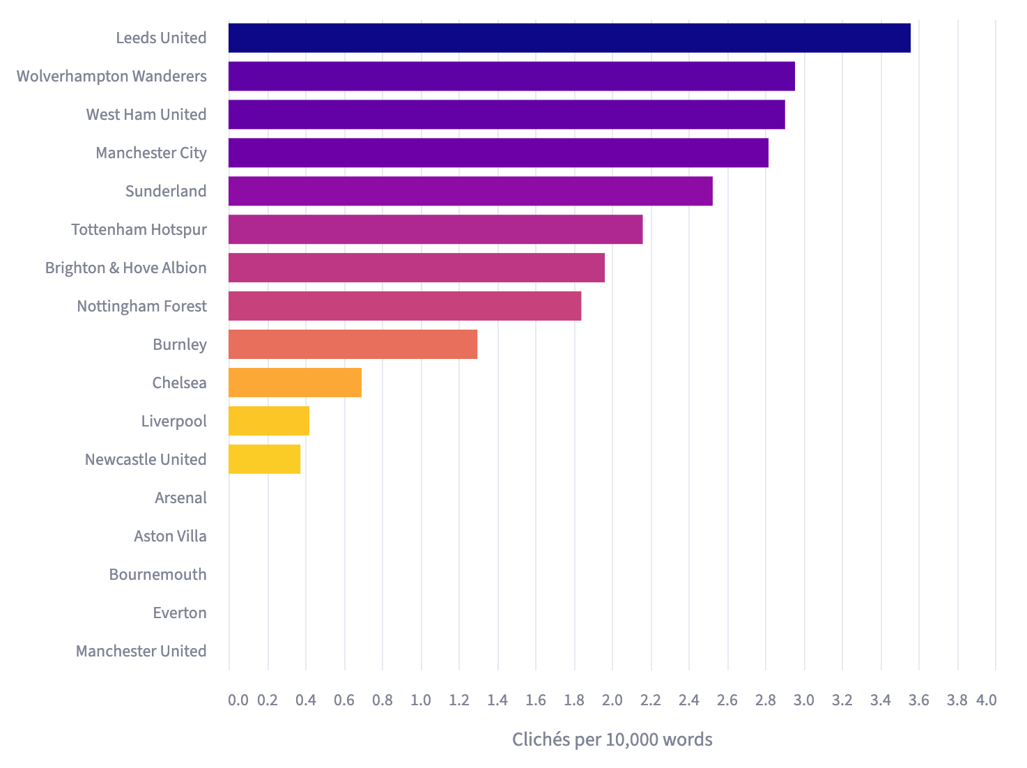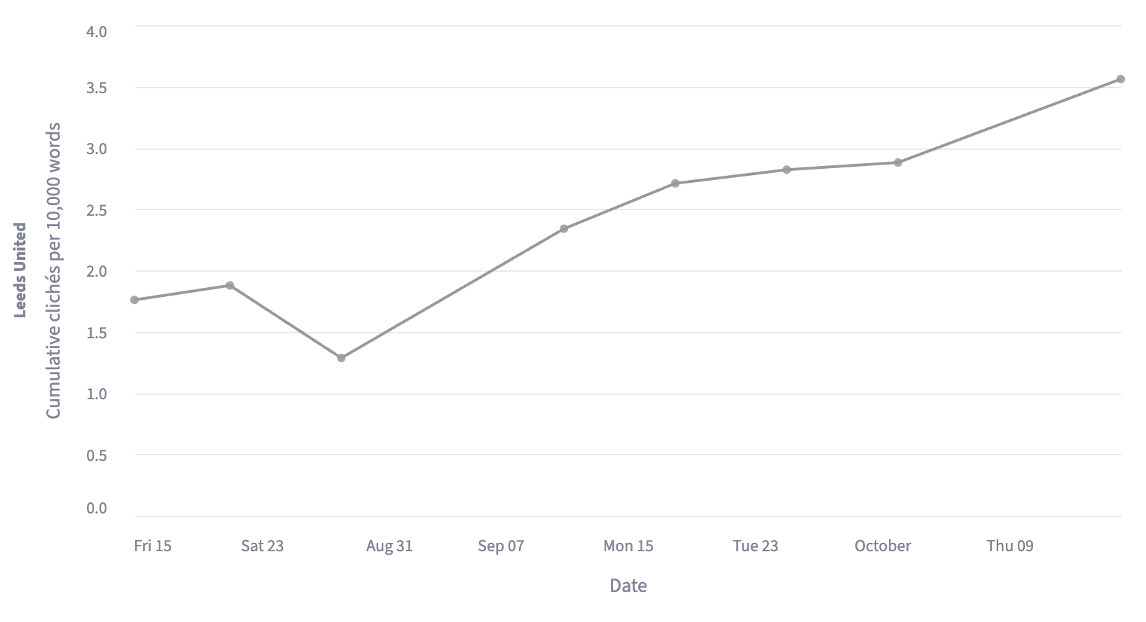 A solid 2.34 clichĂ©s per 10,000 words (C/10k) saw his Leeds side sitting sixth after four games. Four press conferences, 12 clichĂ©s and roughly 26,000 words later, heâs stormed into top spot with a staggering 3.56 C/10k.